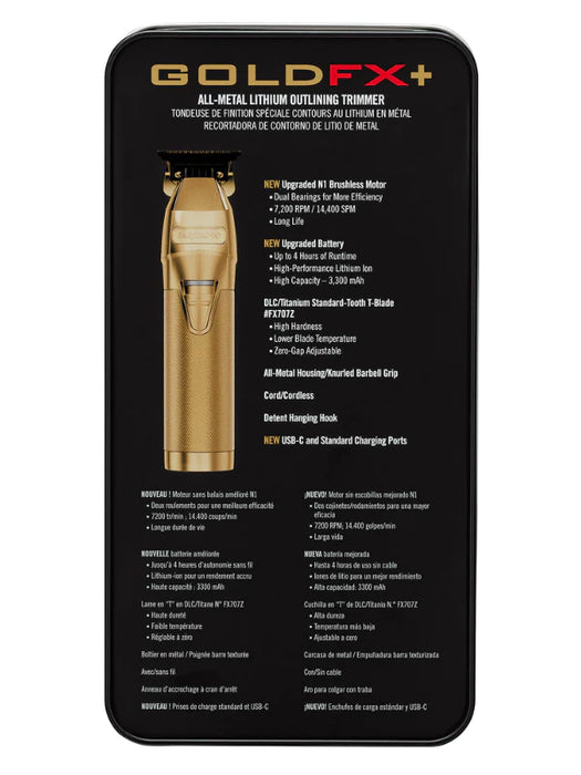 The BaBylissPRO GoldFX+ All-Metal Lithium Outlining Trimmer is more than just a tool; it's a statement of craftsmanship and innovation, designed to meet the needs of the most discerning professionals. Enjoy the perfect blend of power, precision, and style with this state-of-the-art trimming solution.