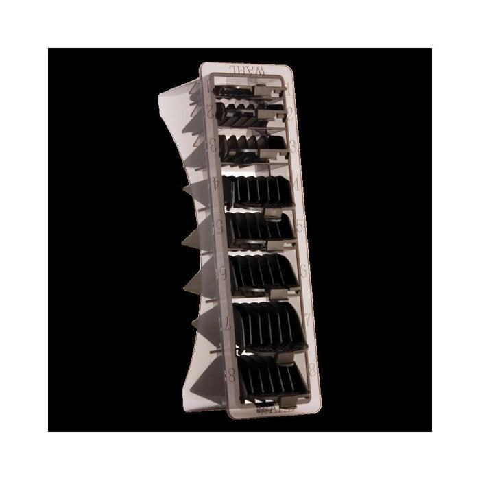 Enhance your cutting experience with the Wahl 8 Pack Cutting Guides with Organizer - Black #3170-500, the perfect accessory for any professional clipper setup.