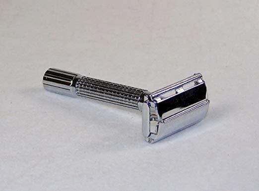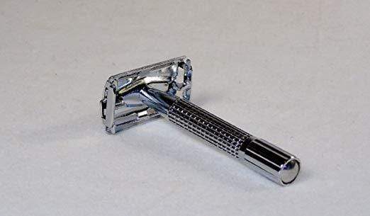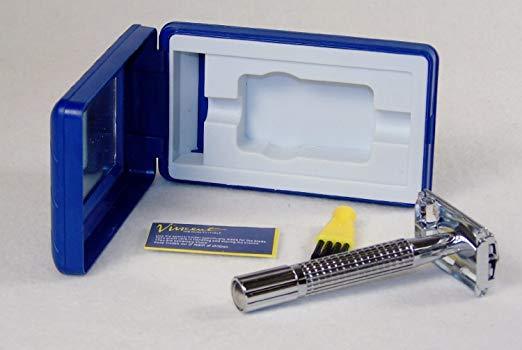 Old-fashioned, double edge razor. Comes with travel case. 3-1/2" long