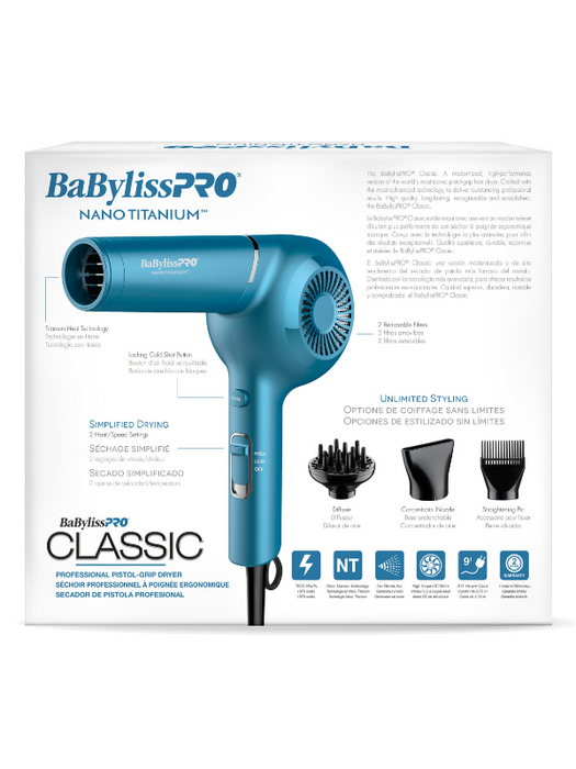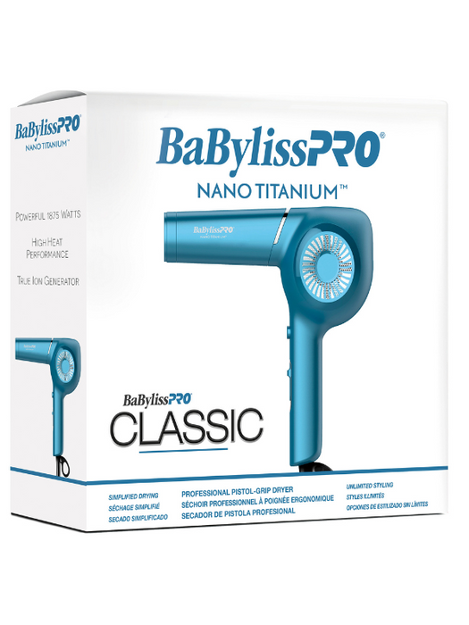 The BaBylissPRO Nano Titanium Classic Professional Pistol-Grip Dryer in striking blue is a modernized, high-performance hairdryer. Crafted with cutting-edge technology, it ensures exceptional results for professionals and enthusiasts alike. Key features include: