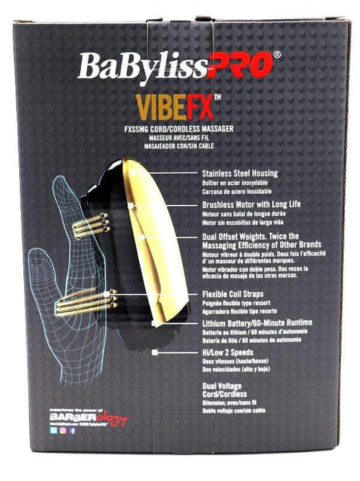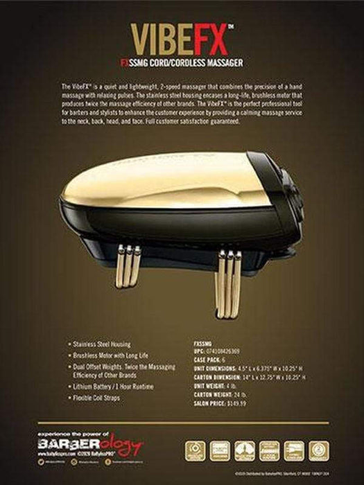 The BabylissPro VIBEFX Gold Massager Cord/Cordless is the perfect addition to any barber or stylist's toolkit, enhancing the customer experience with a touch of luxury and relaxation. It's an ideal way to differentiate your services and provide added value that clients will remember and appreciate.
