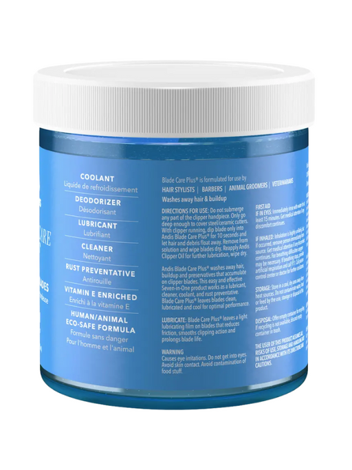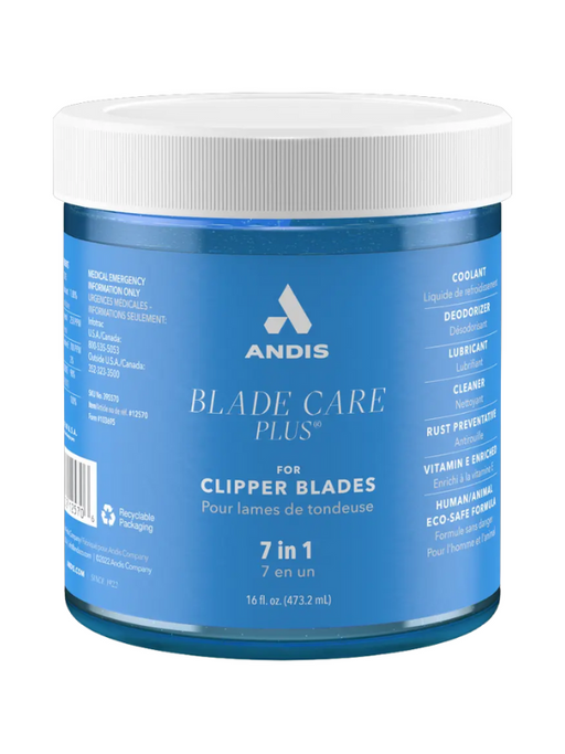 Introducing Andis Blade Care Plus, the ultimate solution for maintaining your clipper blades. This versatile 16oz product effectively washes away hair, buildup, and preservatives that accumulate on clipper blades. It's a Seven-in-One powerhouse, serving as a lubricant, cleaner, coolant, and rust preventative, ensuring your blades stay in top shape.
