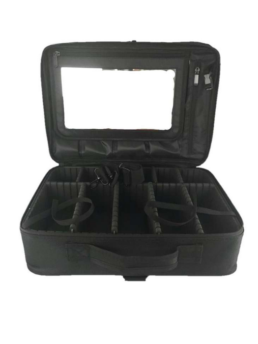 Measuring 16”-inch x 11.5”-inch and 5.5”-inch wide, it’s small enough to take on a plane and carry every day, yet large enough to carry your hair clippers, trimmers, shavers, blades, and accessories. Two inner straps to hold up the inner mirror panel for a comfortable on-site station when you need it.