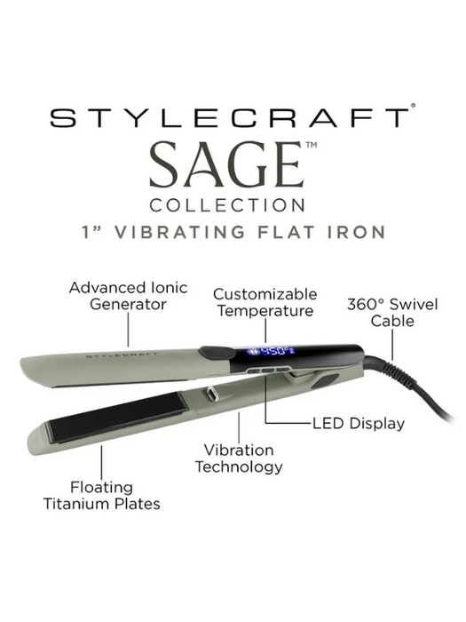 The Stylecraft Sage 1" Titanium Plates Flat Iron utilizes an advanced ionic generator that releases negative ions to seal cuticles, reduce frizz, and enhance shine. The innovative heat & vibration technology applies gentle tension to prevent pulling while boosting smoothness and shine. With 9 customizable heat settings (320°F–450°F), it's perfect for all hair types.