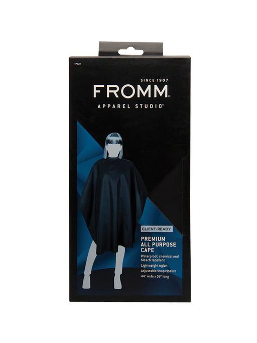 The Fromm Apparel Studio Client Premium Gunmetal Shampoo Cape is best for shampoo/condition and dry/wet cutting and styling. This cape is water, chemical, and bleach repellent.