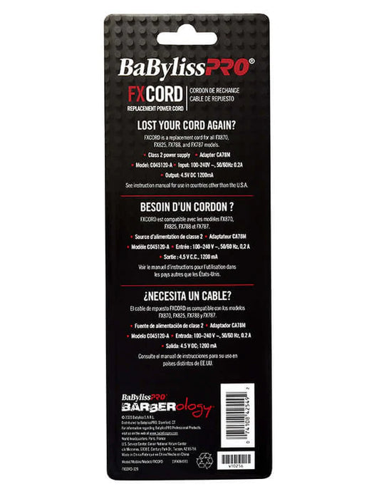 Never let a lost or damaged power cord disrupt your grooming routine again with the BabylissPro FXCORD Replacement Power Cord #FXCORD. Specially designed for compatibility with all FX870, FX825, FX788, and FX787 models, this original equipment from Babyliss ensures your devices remain powered and ready for action. Whether at home or in a professional salon, maintaining your grooming tools in optimal condition is essential for delivering the precise, high-quality cuts Babyliss is known for.