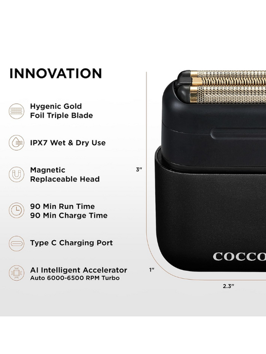 Upgrade your shaving routine with the COCCO IMPACTO Shaver, Hygienic Gold Foil Triple Blade, Black—a revolutionary grooming tool designed for both wet and dry use. Featuring hypoallergenic gold-titanium foils, this shaver ensures a comfortable and irritation-free shave, even for sensitive skin.