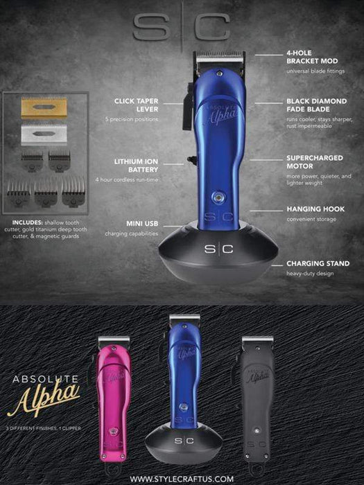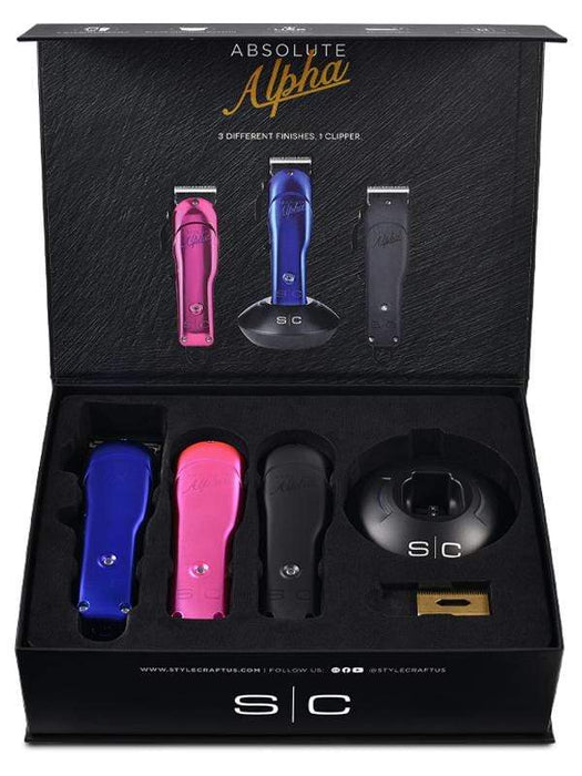 This premium cordless clipper includes a heavy-duty charging stand, 5 magnetic guards for precise cutting lengths, and 3 interchangeable body kits in blue, pink, and matte black. Whether you're customizing your clipper’s look or dialing in the perfect fade, the Stylecraft Absolute Alpha Clipper gives you the freedom to do it all.