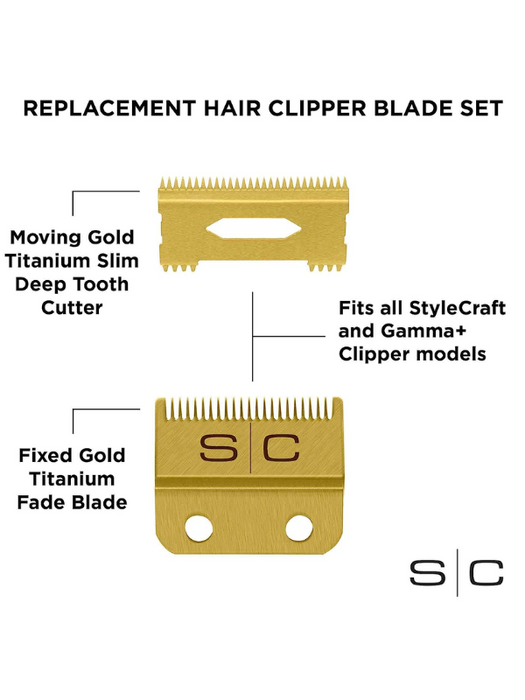 StyleCraft Clipper Fade Blade with Moving Gold Titanium Slim Deep Tooth Cutter Set